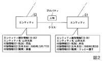 図2示される例のデータは、エンティティE1と、エンティティE2とが、「人物」というプロパティ名のクラスに属する。本実施形態において、各エンティティには、各エンティティを識別することが可能な情報(以下、エンティティ識別情報EID)と、エンティティの属性とが関連付けられる。エンティティの属性は、例えば、エンティティ名や、当該エンティティに付随する付随情報CC等である。エンティティが属するクラスが「人物」である場合、付随情報CCは、例えば、性別(付随情報CC1)、生年月日(付随情報CC2)、及び職業(付随情報CC3)等である。なお、エンティティに対応付けられる付随情報CCは、3つに限られず、3つ未満、又は4つ以上であってもよく、エンティティには、付随情報CCが対応付けられていなくてもよい。エンティティ名は、例えば、「第1属性」の一例である。 In the data of the example shown in FIG. 2, the entity E1 and the entity E2 belong to the class of the property name "person". In the present embodiment, each entity is associated with information that can identify each entity (hereinafter, entity identification information EID) and an attribute of the entity. The attribute of the entity is, for example, the entity name, the incidental information CC attached to the entity, and the like. When the class to which the entity belongs is "person", the incidental information CC is, for example, gender (incidental information CC1), date of birth (incidental information CC2), occupation (incidental information CC3), and the like. The incidental information CC associated with the entity is not limited to three, and may be less than three or four or more, and the incidental information CC may not be associated with the entity. The entity name is, for example, an example of "first attribute".