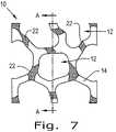 [0036]本発明による骨格のさらなる実施形態によると、強度、最も顕著には、せん断強度を増大させる、連結特徴部22が提供されてもよい。例えば、連結特徴部22は、隣接する層が一緒に入れ子を形成するのを可能にするように構成されていてもよい。それらが積み重ねられると、それらは次いで一緒に結合されて、3次元骨格20を形成してもよい。例えば、ここで、図7および図8を参照して、本発明による層10の表面16または18の実施形態が示され、そこで、連結特徴部22は、層10の表面16または18に形成された複数の逃げ溝22の形態である。図8は、図7の線A-Aに沿った断面図であり、層10のストラット14および孔12との関連で本発明による典型的な逃げ溝22を例示する。逃げ溝22は、層10の厚さDに対して深さMを有し、深さMは厚さDの画分であり、およびしたがって、M=C×Dであり、Cは、Dの所定の画分であり、およびCは、0から1の間である。逃げ溝22は、骨格20の各層10の1つの側または両側に形成され得る。さらに、別の層の対応する突起(不図示)は、隣接する層10の逃げ溝22内に別の層を据え付けるために使用されてもよい。突起が使用されない場合、その結果、隣接する層10のストラット14は、対応する逃げ溝22内に着座することができる。これらの逃げ溝22は、したがって、1つの層10を隣接する層10と一緒に固定する、連結特