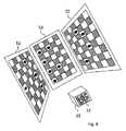 更なる実施形態によれば、カメラ較正計測システムの較正用ターゲットは、その識別のために、識別パターンを有している。これにより、ターゲットは、識別パターン以外は同じパターン、例えば、チェス盤パターンや円パターンを有していることができ、且つ、捕捉された画像内の異なるターゲットは、やはり異なっており識別できるため、パターンの各々のエレメントを全てのターゲット上において正確に識別することができる。この識別パターンは、例えば、正方形など予め定められているパターンエレメント内において、例えば、点やその他の幾何学的形状であることができる。更なる方法としては、色、グレースケール、QRコードなどによるコーディングを挙げることができる。 According to a further embodiment, the calibration target of the camera calibration measurement system has an identification pattern for its identification. Thereby, the targets can have the same pattern other than the identification pattern, for example, a chess board pattern or a circular pattern, and different targets in the captured image are also different and can be identified. Each element of the pattern can be accurately identified on all targets. The identification pattern can be, for example, a point or other geometric shape within a predetermined pattern element, such as a square. As a further method, coding by color, gray scale, QR code and the like can be mentioned.