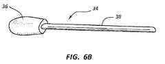 [0096]図6A~6Cは、細長い部材または棒/ステム38を有するスワブまたはスワブスティック34の一実施形態を示している。この細長い部材または棒/ステム38は、図7A~7Cに示されたスワブまたはスワブスティック34よりも(例えば、断面が)丸い側面を有する。図7A~7Cは、細長い部材または棒/ステム38を有するスワブまたはスワブスティック34の一実施形態を示している。この細長い部材または棒/ステム38は、図6A~6Cに示されたスワブまたはスワブスティック34ほどには丸くない側面すなわち角ばった側面を有する。図6A~7Cに示されたスワブまたはスワブスティック34は、備えられ得る可能な他のスワブまたはスワブスティックを代表している。スワブまたはスワブスティック34は、吸収性ヘッド36と、細長い部材または棒/ステム38と、を備えている。吸収性ヘッド36は、洗浄溶液(例えば、ヨードまたはポビドンヨード溶液)中でのより高い飽和と、洗浄されるべき領域の表面領域とのより大きな接触と、を可能にするように構成される。吸収性ヘッド36は、様々な材料から形成することができ、このような材料には、発泡体、レーヨン(例えば、レーヨンのパフまたはレーヨンのスパイラル)、綿、他の材料、および/または、これらの材料のうちの1つ以上の材料の組合せが含まれる。吸収性ヘッドの飽和を向上させるために、吸収性ヘッド36は、洗浄溶液を容易に吸収し分散させる材料から形成されていることが望ましい。吸収性ヘッドで使用するためには、洗浄溶液中でその材料の十分な重量百分率を吸収する材料が望ましく、その材料がさらに、吸収された洗浄溶液の大きな百分率を放出する場合には特に望ましい。すなわち、大量の洗浄溶液を吸収し、さらに、洗浄のために患者に対して使用されるときに大量の洗浄溶液を放出する材料を使用することが望ましい。(レーヨンまたは他の材料とは対照的な)発泡体の吸収性ヘッド36を形成すると、洗浄溶液の吸収性および飽和性が改善された吸収性ヘッド36が得られることが分かった。さらに、発砲体の吸収性ヘッドは、洗浄されるべき患者の領域に接触させたとき、および、洗浄中の領域に押し付けられてわずかに圧縮されたときに、大量の洗浄溶液を容易に放出する。これによって、患者の領域の洗浄がより容易になり、エンドユーザは患者をより優しく洗浄することができる。吸収性ヘッド36が完全にまたは部分的に発泡体で形成されている場合、その発泡体は、オープンセル発泡体、クローズドセル発泡体、ポリウレタン発泡体、高密度発泡体、ラテックス発泡体、ハニーゴールド(honey gold)発泡体または他のタイプの発泡体とすることができる。吸収性ヘッドは、細長い部材または棒に接着するように加熱されてもよく(例えば、発泡体が加熱され、棒に接着されてもよい)、または、他の付着手段が使用(例えば、接着剤が使用)されてもよい。  [0096] FIGS. 6A-6C show an embodiment of a swab or