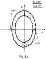図8bは、A=0°およびB=0°のときに、図8aで識別された各測定点において記録された、プローブのスタイラス偏向信号(p、q)を示す。CMM2のクイル14は、円をなして動かされ、球体の赤道34のプロファイルは円形であるので、プローブの「q」信号に対してプロットされた「p」信号のプロファイルは、また、円形であると期待される。しかしながら、図8bに示されるように、qに対するpのプロファイルは楕円形であり、この場合、長軸はp軸に沿って延びる。これは、pとqに対するプローブ信号の挙動の明らかな相違によるものである(例えば、この場合において、そして、示されるように、pは、所定の偏向に対して、qよりも、応答性が高い/より大きい信号を提供するように見える。  FIG. 8b shows the probe stylus deflection signals (p,q) recorded at each measurement point identified in FIG. 8a when A=0° and B=0°. Since the
