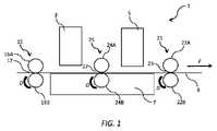 好ましくは、ローラ組立体15、25および21のそれぞれは、矢印Dで示される共通の駆動機構に動作可能に接続されたそれぞれの駆動ローラ(駆動ローラ16B、24Bおよび22B)を含む。例えば、エンドレスベルト(図示せず)が、全ての駆動ローラを名目上一定の速度で駆動するための共通の駆動機構として採用され得る。  Preferably, each of