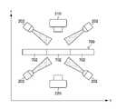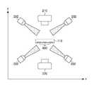 カメラ210及びカメラ220はデジタルカメラにより構成される。図2に示すように、分包袋702(薬包)が連続して構成される薬包帯700の鉛直上側(図3の+Z側)にカメラ210が配置され、薬包帯700の鉛直下側(図3の-Z側)にカメラ220が配置されて、分包袋702に分包された錠剤800(錠剤、対象物)を上下(複数の異なる方向)から撮影して、表面及び裏面について画像(第1の撮影画像)を取得する。分包袋702(薬包帯700)は搬送機構240により図2の+X方向(薬包帯700の長手方向に沿った軸;図2の矢印方向)に搬送され、撮影の際には照明部200が有する複数の光源202が4方向から分包袋702を照明する。図3において、複数の光源202のそれぞれとカメラ210,220の撮影光軸1001との間隔(d1,d2,d3,d4)は同じである。つまり、複数の光源202と撮影光軸1001とが等間隔(d1=d2=d3=d4)である。