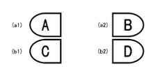 楕円型の錠剤を分割した場合のマッチングについて説明する。図18は楕円錠剤のマスタ画像の例であり、同図の(a)部分は錠剤の表面を示す。表面の左右には、それぞれ“A”、“B”の刻印(または印字)が施されている。また、同図の(b)部分は錠剤の裏面を示す。裏面の左右には、それぞれ“C”、“D”の刻印(または印字)が施されている。この錠剤には、中央に割線が付されている。図18の錠剤を分割した状態を図19に示す。図19の(a1),(a2)部分はそれぞれ表面の左側、右側を示し、同図の(b1),(b2)部分はそれぞれ裏面の左側、右側を示す。このような楕円型の錠剤では、表面と裏面との対応関係が異なる(上述したバルサルタン錠のように、表面と裏面とで刻印の向きが異なる)錠剤が存在する。例えば、図20の(a1),(a2)部分に示すように表面と裏面とで刻印の向き(上下方向)が一致している場合と、同図の(b1),(b2)部分に示すように刻印の向きが異なっている場合とがある。<Matching when splitting oval tablets>