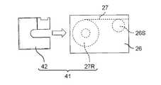 図7A、図7Bに示すように、ケース入りロール体41を保管中或いは運搬中であるときには、キャリアテープ27が有する送り孔27K(スプロケット26Sの外周歯と係合する孔)に、ケース42に設けられたテープ先端保持部42Kを差し込んで係止しておくようにする。なお、ケース入りロール体41を保管中或いは運搬中であるときとは、ケース42にロール体27Rを収納した場合であって、ロール体27Rからキャリアテープ27を引き出して使用する状況にないときを言う。本実施の形態では、2つの送り孔27Kに、ケース42に設けられた2つのテープ先端保持部42Kを差し込んで係止する。これにより保管中或いは運搬中にケース入りロール体41のケース42からキャリアテープ27が抜け出ることが防止され、ひいてはロール体27Rの全体がケース42から脱落することが防止される。  As shown in FIGS. 7A and 7B, when the