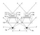 角度b-b’は、使用者の左眼10aの瞳と表示部12aの表示光学部122の外周とを結ぶ接線の角度である。角度e-e’は、使用者の右眼10bの瞳と表示部12bの表示光学部122の外周とを結ぶ接線の角度である。使用者は、この角度b-b’及び角度e-e’の内側にある物体を直接視認することができない。角度b-b’及び角度e-e’の内側は、使用者の死角となる。そこで、角度b-b’及び角度e-e’の内側に、撮像部11a,11b及び表示部12a,12bの表示素子121を配置する。これにより、使用者の視野周辺を遮らずに、表示映像と実視界との連続性を確保することができる。  The angle bb' is the angle of the tangent line connecting the pupil of the user's