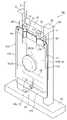 一方、該軟質容器10Aを固定する固定治具2Aは、平板状の基台23と、該基台23に立設された2本の支柱24,24と、支柱24,24の間に架設されて基台23と平行する上側横梁27及び下側横梁28とを有する。上側横梁27の中央位置には、軟質容器10に設けられた貫通孔16と係合可能な係合部26が配置されている。係合部26は、金属又は樹脂材料によりフック状に形成され、接着等で上側横梁27に固定されている。そして、軟質容器10Aは、その貫通孔16と固定治具2Aの係合部26との係合によって、固定治具2Aに吊持された状態で固定されている。  On the other hand, a fixing