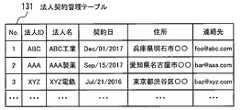 図6は、法人契約管理テーブルの一例を示す図である。法人契約管理テーブル131内の各レコードには、レコード番号(No.)に対応付けて、法人ID、法人名、契約日、住所、および連絡先が設定されている。法人IDは、契約をしている法人(企業、公的機関など)の識別子である。法人名は、契約をしている法人の名称である。契約日は、法人がデータ提供の契約をした日付である。住所は、法人の所在地である。連絡先は、法人の連絡先を示す情報(例えば代表の電子メールアドレス)である。 FIG. 6 is a diagram showing an example of a corporate contract management table. Each record in the corporate contract management table 131 has a corporate ID, corporate name, contract date, address, and contact information associated with the record number (No.). A corporation ID is an identifier of a corporation (company, public institution, etc.) that has a contract. The corporate name is the name of the contracting corporation. The contract date is the date on which the corporation concluded the data provision contract. The address is the location of the legal entity. The contact information is information indicating the contact information of the corporation (for example, the e-mail address of the representative).