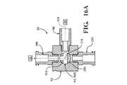 図9~図15を参照すると、以下に更に詳細に説明する例示的な一実施形態において、弁92は、第1の形態と第2の形態との間の移動が回転であるようなロータ弁である。しかし、弁92は、どのような形式の弁、例えば、制限されないが、ボール弁、ピンチ弁、バタフライ弁、グローブ弁、等であってもよい。加えて、第1の形態と第2の形態との間の弁92の移動は、どのような形態の移動、例えば、制限されないが、リニア移動、並行移動、反復移動、及び/又は振動であってもよい。また、第1及び第2の形態において画定される流路は、種々の弁によって画定されてもよい。例えば、システムと協働して作動する多重弁が設けられてもよい。  9-15, in one exemplary embodiment described in more detail below, the