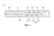 図4c及び図5は、図4aのボックスCの接写図である。具体的には、図5は、図4cの線D-Dでの断面図である。第1の制御ワイヤ9aは、アンカー要素21としてスパイラルコイル構造を含む。アンカー要素21は、第1の制御ワイヤ9aに固定される。この固定は、溶接、ろう付け及び/又は接着によって行うことができる。固定後、スパイラルコイル構造は、壁8に埋め込まれた突起要素27となる。スパイラルコイル構造をアンカー要素として用いることにより、ミニチュアサイズの突起要素21の高さ及びピッチの正確性を制御することができる。また、制御ワイヤとアンカー要素の組立てプロセスにおいてばねの復元力を利用することにより、セルフクランプ機能をもつことが有利である。更に、ワイヤの長手方向に沿ったこのような突起要素27は、1つの部品のみで作製することができる。突起要素27は、壁8に埋め込まれている(図5)。突起要素は、制御ワイヤの長手方向の長さに沿って展開するので、第1のアンカリング部15aも、第1の制御ワイヤ9aに沿って形成される。接続及び/又は取付けの強度を高めるために、アンカリング部15aの突起の長さ及び/又は高さを増大させることができる。第1のアンカリング部15aでは、第1の制御ワイヤ9aが湾曲可能体7によって拘束される。したがって、第1の制御ワイヤ9aは、押し引きの力及びトルクを湾曲可能体7に伝達して、第1の湾曲可能セグメント12を作動させることができる。当然のことながら、残りの制御ワイヤ10a~11cは、制御ワイヤ9a~9cとの共通の特性及び構成の類似点を共有する。  Figures 4c and 5 are close-up views of box C in Figure 4a. Specifically, FIG. 5 is a cross-sectional view along line DD of FIG. 4c. The