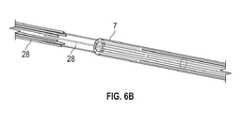 図6a、図6b、図6cは、湾曲体7の作製とアンカーセグメント15~17の埋込みのための製造プロセスを説明する。まず、第1の制御ワイヤ9a,9b,9cの指定の位置にアンカー要素21があるように、第1の制御ワイヤ9a,b,c及びアンカー要素21が組み立てられる(図6a)。アンカー要素21と組み立てられた第1の制御ワイヤ9a,9b,9cは、所望の位置で壁8の適切なルーメン34に挿入される。何も入っていない残りのルーメン34には、マンドレル28が挿入されてよい。また、ツールチャネル18には大きめのマンドレル28が挿入されてよい(図6b)。マンドレル28は、何も入っていないルーメン34及びツールチャネル18の構造的完全性及び寸法を保持するために挿入される。湾曲可能体7の壁8に突起要素27を埋め込むために、湾曲可能体7は、ヒーター29を用いて、アンカー要素21の周りのみ加熱/リフローされる(図6c)。加熱プロセスにより、アンカー要素21と湾曲可能体7/壁8との間に融合が形成される。融合は、1つ以上の物質が固体から液体へ相転移し、続いて1つ以上の物質を冷却し、それにより融合した1つ以上の物質を固体に戻す物理的プロセスによって、達成することができる。そのようなステップを通して、アンカー要素21は、業界標準のカテーテル製造ステップを用いて埋め込まれる。  Figures 6a, 6b, 6c illustrate the manufacturing process for making the
