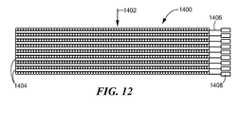 例えば、BaFCl(Eu)またはGadoxから作製される、従来のシンチレーションスクリーンの吸収効率は、約80keVを上回るX線エネルギーの場合、50%を下回って降下する。2つの層の場合の50%点は、約100keVである。違いとして、Sc-WSF検出器は、検出器のプロファイルを実質的に増加させずに、3つ以上の層のシンチレータとともに作製されることができる。費用効果的Sc-WSF検出器は、4層を伴うものであって、標準的140keVX線管によって発生される走査X線ビームを用いて、TXのために使用されることができる。図12に示され、概して、番号1400によって指定されるような9層検出器等の多層検出器は、入口を通した車両のX線検査において使用されるもの等、標準的225keVX線管(図示せず)によって放出されるX線1402を検出するために非常に効果的であり得る。シンチレータ材料の層1404が示され、WSFファイバ1406が、光検出器1408に結合される。TX for X-ray beams up to at least 250 keV