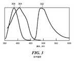 冒頭で簡単に前述されたように、波長シフトファイバ(WSF)は、長年、シンチレーション検出のために採用されている。波長シフトファイバは、比較的に高屈折率を伴うコアから成り、より低い屈折率の1つ以上のクラッディング層によって囲繞される。コアは、染料とも称される、波長シフト材料を含有する。ファイバに入射する、シンチレーション光は、染料によって吸収され、順に、より長い波長を伴う光を放出する。より長い波長光は、ファイバ材料内で等方的に放出される。全内部反射は、その光の一部を捕らえ、比較的に低損失を伴って、長距離にわたって、それを伝導させる。これは、図3を参照して説明されるように、染料の吸収304および放出302波長範囲が、波長シフト光が再吸収されないように、効果的に重複しないため、可能である。捕捉された割合は、ファイバの表面における屈折率の比率によって判定される。WSFの付加的利点は、波長シフトが、シンチレーション光306を光検出器(PMT、シリコン光電子増倍管(SiPM)、または多画素光子検出器(MPPC)、またはその他)の敏感波長範囲内にもたらすことができることである。  As briefly mentioned in the introduction, wavelength-shifting fibers (WSFs) have been employed for scintillation detection for many years. A wavelength-shifting fiber consists of a core with a relatively high refractive index, surrounded by one or more cladding layers of lower refractive index. The core contains a wavelength-shifting material, also called a dye. Scintillation light, incident on the fiber, is absorbed by the dyes, which in turn emit light with longer wavelengths. Longer wavelength light is emitted isotropically within the fiber material. Total internal reflection captures some of that light and transmits it over long distances with relatively low loss. This is possible because the dye's