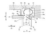 従って、突起部の端部を案内部材の端部より流体の流れ方向における上流側に位置させることから、旋回流生成室から流体の主流に合流する漏れ流体の出口を狭くすることで、旋回流生成室から排出される周方向の速度成分が減少した漏れ流体と、旋回流生成室に流れ込む周方向の速度成分を有する漏れ流体とが干渉して発生した渦流を旋回流生成室に容易に閉じ込めることができる。 Therefore, since the end of the protrusion is located upstream in the flow direction of the fluid from the end of the guide member, the outlet of the leaked fluid that joins the main flow of the fluid from the swirling flow generating chamber is narrowed, thereby generating the swirling flow. The vortex generated by the interference between the leaked fluid discharged from the generation chamber with a reduced circumferential velocity component and the leaked fluid flowing into the swirl flow generation chamber and having a circumferential velocity component is easily confined in the swirl flow generation chamber. be able to.