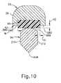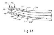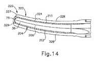 超音波ブレード(36)の組織処置部分は、クランプアーム(38)(視界から隠されている)に面し、かつクランプアーム(38)に対して組織を圧縮するように構成されている、上部一次処置側部(206)を含む。組織処置部分は、一次処置側部(206)の反対に配置され、かつクランプアーム(38)から離れるように面する、切断縁(208)を有する、下部二次処置側部を更に含む。切断縁(208)は、バックカッティング処置中に組織を切断するように構成される。第1及び第2の側方ブレード側部(210、212)は、一次処置側部(206)と切断縁(208)との間に延在する。図9の断面図に最良に示されるように、一次処置側部(206)は凸状に丸みを帯びている。加えて、第1及び第2の側部(210、212)の各々は、直線ブレード領域(202)の遠位部分及び湾曲したブレード領域(204)の全体を、その湾曲した経路に沿って、通って遠位方向に延在する、広範囲の平坦側面(214)を含む。図9に示されるように、広範囲の平坦側面(214)は、一次処置側部(206)の丸みを帯びた処置表面から下向きに垂れ下がり、互いに略平行である側方側縁を有する超音波ブレード(36)の断面を画定する。 A top portion, wherein the tissue treatment portion of the ultrasonic blade (36) faces the clamp arm (38) (hidden from view) and is configured to compress tissue against the clamp arm (38). Includes primary treatment side (206). The tissue treatment portion further includes a lower secondary treatment side having a cutting edge (208) disposed opposite the primary treatment side (206) and facing away from the clamp arm (38). Cutting edge (208) is configured to cut tissue during a backcutting procedure. First and second lateral blade sides (210, 212) extend between the primary treatment side (206) and the cutting edge (208). As best shown in cross-section in FIG. 9, the primary treatment side (206) is convexly rounded. In addition, each of the first and second sides (210, 212) extends through the distal portion of the straight blade region (202) and the entirety of the curved blade region (204) along its curved path, It includes an extensive flat side (214) extending distally therethrough. As shown in FIG. 9, the broad flat side (214) depends downwardly from the rounded treatment surface of the primary treatment side (206) and has lateral side edges that are generally parallel to each other. Define the cross-section of (36).