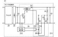 コンデンサC4は、AC/DC変換部21の出力間において、スイッチング素子Q2とインダクタL1との直列回路に並列に接続されている。コンデンサC4は、スイッチング素子Q2、インダクタL1及びダイオードD2とで降圧された電圧を平滑する。  Capacitor C4 is connected in parallel to the series circuit of switching element Q2 and inductor L1 between the outputs of AC/