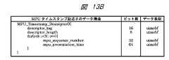 図2Aに、本実施例のMMTにおける符号化信号の概要の一例を示す。同図に示したように、本実施例のMMTは、符号化信号を構成する要素として、MFU(Media Fragment Unit)、MPU(Media Processing Unit)、MMTP(MMT Protocol)ペイロード、MMTPパケットを有するものとする。MFUは、映像や音声等の伝送時の形式であり、NAL(Network Abstraction Layer)ユニット単位やアクセスユニット単位で構成されて良い。MPUは、MPU全体の構成に関する情報を含むMPUメタデータと、符号化したメディアデータの情報を含むムービーフラグメントメタデータと、符号化したメディアデータであるサンプルデータと、で構成されて良い。また、サンプルデータからはMFUを取り出すことが可能であるものとする。また、映像コンポーネントや音声コンポーネント等のメディアの場合、MPU単位やアクセスユニット単位で提示時刻や復号時刻が指定されても良い。図2Bに、MPUの構成の一例を示す。 FIG. 2A shows an example of an outline of a coded signal in MMT of this embodiment. As shown in the figure, the MMT of this embodiment has an MFU (Media Fragment Unit), an MPU (Media Processing Unit), an MMTP (MMT Protocol) payload, and an MMTP packet as elements constituting an encoded signal. and The MFU is a format for transmitting video, audio, and the like, and may be configured in NAL (Network Abstraction Layer) unit units or access unit units. The MPU may consist of MPU metadata containing information about the overall structure of the MPU, movie fragment metadata containing information about the encoded media data, and sample data which is the encoded media data. It is also assumed that the MFU can be extracted from the sample data. In the case of media such as video components and audio components, presentation time and decoding time may be specified for each MPU or each access unit. FIG. 2B shows an example of the configuration of the MPU.