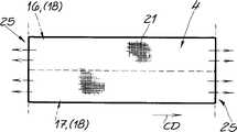 冷却チャンバ4のMD側25を介した本発明による冷却空気の排出が、特に図2、図3及び図4に示されている。ここで、冷却空気体積流量は、機械方向MDに対して横方向へ、したがってCD方向へ、あるいは本質的にCD方向へ排出される。流れベクトルの方向は、図において冷却空気流を象徴する矢印に対応する。本発明による措置に基づき、冷却空気は、本発明による利点を生じさせる、ここでは縁部範囲において、好ましくは(CD方向における)流れ方向を得る。  The cooling air discharge according to the invention via the