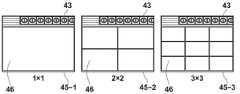 画像表示領域45において、表示枠46の数はユーザによって予め設定することが可能である。図5は本開示の一実施形態である画像表示領域45の構成の一例を示す図である。ユーザは、一例として図5に示すように、表示枠46が1×1のグリッド状に配列された画像表示領域45-1、表示枠46が2×2のグリッド状に配列された画像表示領域45-2、及び表示枠46が3×3のグリッド状に配列された画像表示領域45-3等の配列構成から任意の配列構成を予め選択する。画像表示領域45の表示枠46の配列構成は、テンプレートとして一次記憶部12に記憶されており、ユーザは例えば第1プルダウンメニュー44cにより選択する。なお、画像表示領域45において、表示枠46の配列構成をユーザが視認し易いように表示枠46の外枠を示す枠線を表示させてもよいが、枠線を非表示としてもよい。  In the