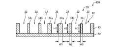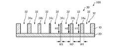 グリッド部材30は、第1部分34aと、第2部分34bと、第3部分34cと、を有する。第1部分34a、第2部分34b、および第3部分34cは、互いに幅が異なる。第2部分34bの幅W2は、第1部分34aの幅W1よりも小さく、第3部分34cの幅W3は、第2部分34bの幅W2よりも小さい。図示の例では、第1部分34aは、グリッド部材30のうちの幅が最も大きい部分であり、第3部分34cは、グリッド部材30のうちの幅が最も小さい部分である。  The