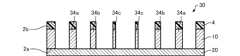 例えば、まず、基板2を第1部分34aの上面の深さまでエッチングする。その後、第1部分34a上をレジストで覆う。次に、基板2を第2部分34bの上面の深さまでエッチングし、第2部分34b上をレジストで覆う。次に、基板2を第3部分34cの上面の深さまでエッチングし、第3部分34cを覆う。その後、基板2をX線透過膜20が露出するまでエッチングする。これにより、第1部分34a、第2部分34b、および第3部分34cを有するグリッド部材30を形成できる。  For example, first, the