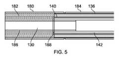 図5は、図3A~図3Cに関連して、上述の層状構造の同軸ケーブル12と共に使用できる、別のプローブ先端部14を示す。プローブ先端部14は、最内側層142内に挿入される管構造であり、及びチャネル130の一部を画定する、第1電極186を備える。最内側層142は、PTFE管でもよい。誘電体層182は、第1電極186上に提供される。図4に示した実施形態と同様に、第2導体180は、外側導電層136に接続する薄壁銅シリンダーである。第1電極186は、誘電体材料182と最内側層142の間に握持される、金属リング188を介して、内側導電層140に接続している。プローブ先端部14の外径は、2.5mmであり、チャネル130は、0.8mmの直径を有し、誘電体182は、0.65mmの壁厚を有する。チャネル130の低減した直径及び誘電体182の増大した厚さは、プローブ先端部14のインピーダンスを増加させて、低誘電率材料が誘電体層182のために使用されるのを可能にする。  FIG. 5, in conjunction with FIGS. 3A-3C, illustrates another