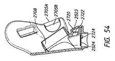 図示の通り、マスクアセンブリ2100は、好ましくは、鼻孔の周りに丸みを帯びた隆起を形成するように広がる鼻翼または小鼻の周りに延在しかつその上側を密封するように適合される。図示のマスクアセンブリ2100は、鼻柱(columella)と呼ばれることもある鼻中隔の肉付きのよい外側端部の一部または全体を含み得る、鼻孔への開口部を画成する表面の周りを密封するように適合される。いくつかの構成では、マスクアセンブリ2100は、上方に延在して、使用者の鼻の背部の左および右の側壁の少なくとも一部に沿って密封するように適合される。いくつかの構成では、マスクアセンブリ2100は、使用者の鼻の鼻梁の領域まで上方には延在せずに、背部の左および右の側壁の少なくとも一部に沿って、上方に延在するように適合される。いくつかの構成では、マスクアセンブリ2100の主密封面は、使用者の鼻の下面と、場合により上唇および/または鼻の下面と上唇との間の移行領域とに接触する。マスクの副密封面は、使用者の鼻の側面と、場合により鼻に近い位置にある頬とに接触し得る。そのような主および副密封面は、全ての使用者の顔には接触しないことがあり得る。しかしながら、そのような配置構成は、比較的広範囲の顔の幾何学的形状との好適な密封をもたらし得る。マスクアセンブリ2100は、好ましくは、使用者の口の少なくとも一部の周りも密封する。マスクアセンブリ2100は、使用者の口と鼻との間を密封するように適合されてもまたはされなくてもよい。  As shown, the