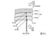 なお、各波長に対応する感度を有する感光材料をホログラフィック感光層に分散させておき、各波長の参照光LrR、LrG、LrBおよび物体光LsR、LsG、LsBを用いてホログラフィック感光層に干渉露光を行うことによって、図3Bに示すように1つの層に干渉縞751R、751G、751Bを重畳した干渉縞751を形成してもよい。また、参照光LrR、LrG、LrBおよび物体光LsR、LsG、LsBとして球面波の光を用いてもよい。  A photosensitive material having a sensitivity corresponding to each wavelength is dispersed in the holographic photosensitive layer, and the reference beams LrR, LrG, and LrB and the object beams LsR, LsG, and LsB of each wavelength are used to interfere with the holographic photosensitive layer. By performing exposure, as shown in FIG. 3B,