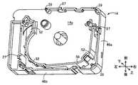 図6に示すように、印刷テープゲート42の左端から左側へ伸びる案内壁50は、外周壁46の短辺部46aに到達する前に長辺部46b側すなわち後方へ曲がり、第2円周壁36に沿って延設されて長辺部46bへ接続されている。  As shown in FIG. 6, the