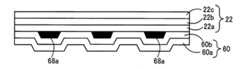 図15は、カセット10から送り出された印刷テープ22および貼合せテープ60の積層体を模式的に示している。印刷テープ22の被印刷テープ22a側すなわち印刷面側に、一面に粘着剤60bが塗布された透明フィルム60aから構成された貼合せテープ60が、貼り着けられている。これにより、印刷テープ22の印刷面に転写されたインク68aが保護される。なお、図15に描かれた積層体の各部材22a~22c,60a,60b,68aの大きさや寸法比等は必ずしも正確ではない。  FIG. 15 schematically shows a laminate of the