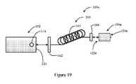 図19は、本開示のいくつかの実施形態による、可撓性光結合器160を有する例示的処置デバイス100eを示し、可撓性光結合器160は、処置デバイス本体102と取り替え可能先端部材104eとを結合する。処置デバイス本体102は、図2に示す本体と同様のものであってもよい。デバイス本体102は、治療光源、関連電子機器及び可搬電源を収容することができる。更に、デバイス本体102は、ユーザ・インターフェース114を組み込むことができる。ユーザ・インターフェースは、単純なスイッチ又はボタンとして示され、押下し、デバイス本体102内に収容した治療光源を起動し、治療光を本体102の遠位端部120に向かって送出することができる。ユーザ・インターフェース114は、単純なボタンとして示しているが、上記した治療光源のパラメータを調節する他のスイッチ及び/又はダイアルを更に含むことができる。  FIG. 19 shows an