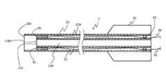 ここで、インナーシャフト11およびアウターシャフト21の寸法としては、例えば、インナーシャフト11の内径が0.5mm~1.5mm、長さが800mm~1500mm、アウターシャフト21の内径が0.8mm~4mm、長さが800mm~1500mmに設定することができる。なお、インナーシャフト11の外周面とアウターシャフト21の内周面との間には、後述する超音波素子31から延びる通信・送電用のコード32を挿通できる程度の空間を有することが好ましい。  Here, as for the dimensions of the