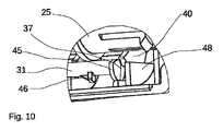 皮膚接触が適切に検出された場合、皮膚センサ回路(57)は、プログラマブル制御システム(54)へと信号を送信する。次いで、後者が、ギアアセンブリ(66)を介して駆動モータギア(35)に係合して、針ブレーキの円筒形の本体(31)を長手軸(8b)を中心にして回転させるように、駆動モータ(67)に命令することにより、針ブレーキ(31)の解除を開始および達成させる。このとき、遠位アバットメントは、好ましくは180°であるが、おおむね0°から180°までの間に含まれる角度だけ回転し、結果として、遠位アバットメント表面(39)がもはや第1の内壁突出部(40)に当接しなくなる。この状況が、図9に示されている。 Skin sensor circuit (57) sends a signal to programmable control system (54) if skin contact is properly detected. The latter then engages the drive motor gear (35) via the gear assembly (66) to rotate the cylindrical body (31) of the needle brake about the longitudinal axis (8b). Disengagement of the needle brake (31) is initiated and accomplished by commanding the motor (67). The distal abutment is then rotated through an angle, preferably 180°, but generally comprised between 0° and 180°, so that the distal abutment surface (39) is no longer in the first position. It is no longer in contact with the inner wall protrusion (40). This situation is illustrated in FIG.