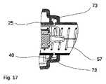 ユーザが針ガード本体を皮膚から移動させ、あるいは皮膚を針ガード本体(25)の端部から遠ざけると、図16、図17、および図18に示されるように、針ガード本体(25)が、やはり針ガード本体(25)の遠位端の内壁(60)に当接していたコイルばね(57)に蓄えられていた運動エネルギの解放の作用下で、今や遠位方向に前方へと移動する。コイルに蓄えられたエネルギが解放されるとき、コイルばねは、抑圧された状態から、抑圧されていない状態、または比較的抑圧されていない状態へと移行する。針ガード本体(25)の遠位方向への移動は、本体(25)が最終位置へと移動するにつれて針(13)が針ガード本体(25)によって再び遮蔽され、完全に覆われるような移動である。最後の第4の不可逆な位置に到達したとき、外周フランジ(41)のエッジ(44)が、ハウジング(4)の遠位端の付近においてハウジング(4)に設けられた小径の内壁突出部(40)とほぼ同じ位置に位置する。周辺フランジ(41)のエッジ(44)が、内壁突出部に当接して、ユーザが針ガード本体(25)を長手軸(8a)から外れるように揺すり、あるいは横方向に変位させようと試みることを防止する。さらに、針ガード本体に設けられたフック状の突出部(73)が、小径の内壁突出部を通過した後に弾性的に半径方向に広がり、針ガード本体を再び近位方向にハウジング内へと押し戻す試みを防止して、針またはシリンジアセンブリの将来の使用を防止する。その後に、薬物送出アセンブリ(2)を伝達アセンブリ(3)から取り外し、適切なやり方で廃棄することができる一方で、駆動伝達アセンブリは、新たな未使用の薬物送出アセンブリとの再接続の後に再び使用することができる。 When the user moves the needle guard body away from the skin or moves the skin away from the end of the needle guard body (25), the needle guard body (25), as shown in Figures 16, 17 and 18, It now moves distally forward under the action of the release of the kinetic energy stored in the coil spring (57), which was also in contact with the inner wall (60) of the distal end of the needle guard body (25). . When the energy stored in the coil is released, the coil spring transitions from a constrained state to an unconstrained or relatively unconstrained state. Distal movement of the needle guard body (25) is such that the needle (13) is again shielded and completely covered by the needle guard body (25) as the body (25) moves to its final position. is. When the last, fourth, irreversible position is reached, the edge (44) of the outer peripheral flange (41) aligns with a small diameter inner wall projection ( 40) at almost the same position. The edge (44) of the peripheral flange (41) abuts against the inner wall projection and the user attempts to rock or laterally displace the needle guard body (25) off the longitudinal axis (8a). to prevent In addition, hook-like projections (73) on the needle guard body elastically expand radially after passing the small diameter inner wall projection, pushing the needle guard body back into the housing in the proximal direction again. Prevent attempts to prevent future use of the needle or syringe assembly. The drug delivery assembly (2) can then be removed from the transmission assembly (3) and disposed of in an appropriate manner, while the drive transmission assembly is reconnected after reconnection with a new, unused drug delivery assembly. can be used.