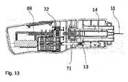 図13が、針ブレーキが解放され、あるいは駆動モータギアから外れ、円筒形の本体(31)の遠位端(37)の遠位アバットメント表面(39)が、コイルばね(50)およびカラー(51)によって遠位方向に押され、遠位側の第2の内壁突出部(48)に当接した後の装置の概略の断面図による全体図を示している。 FIG. 13 shows that the needle brake is released or disengaged from the drive motor gear and the distal abutment surface (39) of the distal end (37) of the cylindrical body (31) is forced through the coil spring (50) and collar (51). ) and abut against the distal second inner wall projection (48).