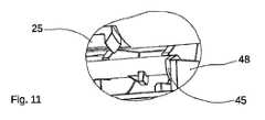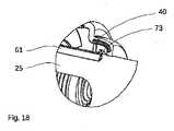 図10が、円筒形の本体(31)の回転後の遠位アバットメント(37)の拡大図を示している。弓状のエッジ(45)が第1の内壁突出部(40)から遠ざかるように移動し、結果として遠位アバットメント表面(39)がもはや前記第1の内壁突出部(40)に当接していないことを、見て取ることができる。図10に示されるように、遠位アバットメントは、今やコイルばね(50)およびカラー(51)の解放された運動エネルギの推進力の下で遠位方向に平行移動できるように形作られており、したがって遠位アバットメント表面は、前記第2の内壁突出部(48)に当接する。結果として、針ガード本体(25)は、図11に示されるように、第2の注射準備完了位置に向かって近位方向に移動し続けることができる。円筒形の本体(31)の近位端(32)における針ブレーキの対応する解除が、図12に示されており、ギア係合手段(34)が歯付きコグ(84)および駆動モータギア(35)から外れていることを見て取ることができる。 Figure 10 shows an enlarged view of the distal abutment (37) after rotation of the cylindrical body (31). The arcuate edge (45) moves away from the first inner wall projection (40) so that the distal abutment surface (39) no longer abuts said first inner wall projection (40). You can see that there is none. As shown in FIG. 10, the distal abutment is now configured to translate distally under the motive force of the released kinetic energy of the coil spring (50) and collar (51). The distal abutment surface thus abuts said second inner wall projection (48). As a result, the needle guard body (25) can continue to move proximally toward the second injection-ready position, as shown in FIG. A corresponding release of the needle brake at the proximal end (32) of the cylindrical body (31) is shown in FIG. ).
