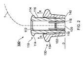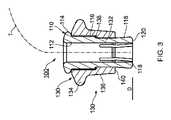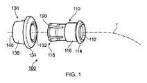 コレット110は、カラー130の貫通アパーチャ132内に滑り嵌めされるものであり、したがってカラー130は、コレット110のフィンガ118を覆っておよびコレット110の中間部分116の周囲に取り付け可能である。カラー130は、フィンガ118を選択的に偏向または弛緩させるためにフィンガ118および中間部分116に沿って操作されることが可能であり、この偏向により、以下でさらに詳細に説明されるようにチューブのグリッピングがなされる。カラー130の操作は、手動による押し引きが可能な、カラーの本体136から延在するカラーの遠位端部に位置するカラーフランジ134により支援される。カラーは、遠位端部140を有する。フィンガ118は、コレットの遠位端部120に向かって外方にフレア状をなし、したがって、アパーチャ132がほぼ一定の内径を有するものである場合に、コレット110のコレットフランジ114から遠位端部120への方向にカラー130をスライドさせることにより、アパーチャ132の内径部がフィンガ118の外面に当接し、このアパーチャ132の内径部がチューブクランプ固定作用をもたらすように内方へと押されることが、理解されよう。
