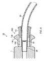 さらに詳細には、カラー430の内方表面が戻り止め432を有し、この戻り止め432は、カラーがフィンガに対してねじり動作された場合にフィンガ418のテーパ状部分431に対して作用する。周方向ランプ431はそれぞれ、カムとして機能し、このカムは、使用時にカラーがこの例では矢印Rの方向にねじり動作される場合に、それぞれの戻り止めによってチューブ30に向かって内方に押される。それにより、フィンガ418は、使用時に図13および図14に示す位置から図15および図16に示すクランプ固定位置へとチューブ30の周囲で圧迫されて、その位置において戻り止めは、相補的凹部433内に載置された状態になる。ロッキングのために利用されるねじり動作量は、3つまたはそれ以上の周方向に配置されたフィンガが使用される場合には、120度以下、および好ましくは約90度以下である。  More specifically, the inner surface of