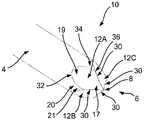 図3に見られるように、本例では、溝12のそれぞれの隣り合ったペア12A、12B;12B、12C;12C、12D;12D、12Aの近位部分19同士は、骨接触外側表面20の湾曲部分21のそれぞれの部分34によって互いに分離されている。骨接触外側表面20の湾曲部分21の各それぞれの部分34はほぼV字状をなしていてよい。ほぼV字状の各部分34の頂点36は、溝12のそれぞれの隣り合ったペア12A、12B;12B、12C;12C、12D;12D、12Aの遠位部分17の縁部によって画定される刃先30の近位端と交わってよい。骨接触外側表面20の湾曲部分21が尖った遠位先端部8に近づくにしたがって長手方向軸5に向かって内側に湾曲していることから、頂点36はヘッド6の側面において張り出さなくなっている(湾曲部分が内側に湾曲していなければより張り出していたはずである)。これにより、ドリルビットが横方向に動かされる際、例えば長手方向軸5を含む平面内で回転される際に、ヘッド6が骨内に横方向に切り込む傾向を大幅に低減することができる。  12B, 12C; 12C, 12D; 12D, 12A of each