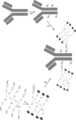 (図18)蛍光標識を含む分岐鎖PEG分子の生成および抗体分子への結合の概略図を示す。ステップ1では、反応性基および蛍光標識を分岐鎖PEG分子上のNH2基に結合させる。ステップ2において、付着部位が抗体分子に付加される。ステップ3では、蛍光標識された分岐鎖PEG分子を抗体分子に共有結合させる。