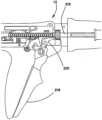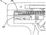 次に図64及び図65を参照すると、ステープルを発火した後、ハンドル組立体12を第3の作動モードに切り替え、この第3の作動モードでは、Iビーム32をその開始位置に近位側に戻す。歯車スイッチボタン232を押し、それにより、アクチュエータシャフト216を90°回転させてアクチュエータ216の後退歯が後退駆動体234に接触する。後退駆動体234は、一連の歯車によってハンドル218に連結されている。ハンドル218を引くと、後退駆動体234は、アクチュエータ216及びIビーム32を引き戻す。トリガハンドル218を多数回引いてIビーム32をその元の位置に戻す。Iビーム32をその元の近位側の位置に戻してジョー48,50を開く。Iビーム32が戻された状態では、スライダ56は、その遠位側の発火位置に残される。図66は、Iビーム32が戻されて完全に引っ込められた状態を示しており、その結果、ばね押し上側ジョー48が開くようになっており、他方、スライダ56は、その遠位側の場所に残され、それによりステープル留めされた組織をジョーから解放することができる。アクチュエータシャフト216及びIビーム32を戻すと、ステープラカートリッジ組立体14をハンドル組立体12から取り外すことができ、そして新品のステープラカートリッジ組立体14を取り付けてステープル留めを続行することができる。  64 and 65, after firing the staples, the