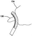 次に図23~図25を参照すると、本発明の一形態では、非対称ステープルカートリッジが提供されている。非対称ステープルカートリッジは、Iビーム32のブレード42の各側にステープルポケットの異なる数の列を利用している。一形態では、ステープルカートリッジは、Iビーム32のブレード42の一方の側にステープルポケットの2つ又は3つの列を有すると共にIビーム32のブレード42の他方の側にステープルポケットのたった1つの列を有し、それにより全部で3つ又は4つの列をなすステープルが作られ、ステープルの1つの列が切断線の一方の側で送り出される。ステープルカートリッジは、単一の一体形部品であっても良く、或いは、1つがブレード42の一方の側部上に配置された2つ又は3つの列をなすステープルを送り出すためのステープルポケットの2つ又は3つの列を有する2つのカートリッジ及びブレード42の他方の側上のたった1つの列をなすステープルを送り出すためのステープルポケットのたった1つの列を有する第2のステープルカートリッジで構成されても良い。非対称ステープラの使用の結果として、有利には、エンドエフェクタ18の直径が減少した小型の器具が得られる。変形例として、エンドエフェクタ18内の節約された空間を利用すると、有利には、同一直径の器具内に追加の構造的支持体を提供することができる。ブレード42の両方の側部上にステープルの2つ又は3つの列が生きている組織を保持するのに好ましい場合があるが、取り出されるべき検体は、取り出されるべき組織上への短時間保持向きに設計された切断線の一方の側上にステープルの1つの列しか必要としない場合がある。その結果得られた小さな器具直径は、或る特定の手技、例えば管腔内ポリープの除去において有益である。かかる手技では、管腔内ポリープ除去ステープラは、ブレードの一方の側上に設けられていて、2つ又は3つの列をなすステープルを切断線の結腸側中に送り出すステープルポケットの2つ又は3つの列及び1つの列をなすステープルを切断線のポリープ側中に送り出すステープルポケットの1つの列を有する。切断線の各側に異なる数のステープル列が使用されているが、ステープラは、これらの特定の外科的用途に合わせて特注可能である。その結果、器械サイズ、特にエンドエフェクタ18の直径の劇的な減少が得られ又は同一サイズのものであるが器械挙動及び信頼性が高められた器械が得られる。図23は、本発明の非対称ステープラを用いた結果としての切れ目を示している。図23は、器官側134中に送り出された互い違いのステープルの3本のライン132及び除去された組織138中に送り出されたステープルの1本のライン136を示している。ステープラ10のどちらの側がより少ない列を送り出すかどうかについての視覚的標識をユーザとしての外科医に提供するため、ステープラ10のエンドエフェクタ18は、ステープルの少ない列を有するステープラ10の側が図24に示されているようにステープルの2つ又は3つ以上の列を有するステープラの側とが異なる色を呈するよう着色されている。例えば、ステープルの単一のラインを備えたステープラの側は、赤色に着色され、ブレードの他方の側は、緑色に着色されている。ステープラ10に施される他の印が可能である。図25に示された別の形態では、ステープラのエンドエフェクタ18は、曲率の凹状部分を例えばポリープ138の側に当てて又はポリープ138の側上に配置し、湾曲したエンドエフェクタの凸状側部を結腸側134に当てて配置するのが外科医に分かるよう湾曲している。湾曲したジョーは、ステープルの列の数が多いブレードの凹状側部と比較して曲率の凹状側部が少ない列のステープルを有する状態でステープラの適正な向きを示す際にユーザとしての外科医を助ける。別の形態では、ステープラブレードの凹状側部は、ステープラブレードの凸状側部に対してステープルの少ない列を有する。  23-25, in one form of the present invention, an asymmetric staple cartridge is provided. Asymmetric staple cartridges utilize a different number of rows of staple pockets on each side of
