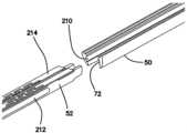 カートリッジ52の別の取り付け形態が図51及び図52に示されている。この形態では、下側ジョー50の前側又は遠位端部は、開いており、カートリッジ52は、下側ジョー50のステープルカートリッジ受け入れ部分72に形成された軌道210と嵌合するレール212を有している。カートリッジ52は、下側ジョー50の開き遠位端部を通って摺動し、この遠位端部は、次に、キャップ又はラッチ(図示せず)で閉鎖される。カートリッジ52は、器具の幅全体にわたる強度を高める頂部プレート214を有するものとして示されている。ステープル54を使い切った後、ステープルカートリッジ52を取り外して処分し、そして新品のカートリッジを挿入してステープル留めを続行するのが良い。別の形態では、ステープルカートリッジ52は、ステープラカートリッジ組立体14内にあらかじめ取り付けられており、ステープル54を使い切った後、ステープラカートリッジ組立体14全体を取り外して処分し、新品のステープラカートリッジ組立体14をハンドル組立体12に連結してステープル留めを続行する。  Another mounting configuration for