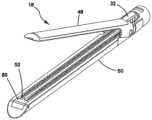 次に図14~図16を参照して下側ジョー50について説明する。下側ジョー50は、上側ジョー48と相補的に嵌合するよう寸法決めされると共に形作られた細長い部品である。下側ジョー50は、開放した頂部及び湾曲した外面を有する。下側ジョー50の断面は、下側ジョーの断面が実質的に円形である近位端部のところを除き、形状が実質的に半円形である。上側ジョー48の垂下したフランジは、近位端部の近くで下側ジョー50に設けられた孔内に挿入されたピンにより下側ジョー50に取り付けられている。互いに取り付けられると、上側ジョー48と下側ジョー50は、実質的に円筒形の輪郭形状を作る。下側ジョー50の遠位端部は、傾けられ、円筒形近位端部は、図16で見える垂直に差し向けられたスロット70を備えている。このスロット70は、アクチュエータシャフト22の延長Iビーム部分30を受け入れるよう寸法決めされると共に形作られており、Iビーム32それ自体は、スロット70の遠位側で下側ジョー50内に位置している。円筒形近位端部は、外側管20に取り付けられるようになっている。下側ジョー50は、ステープルカートリッジ受け入れ部分72を更に有している。1つ又は2つ以上のステープルカートリッジ52が下側ジョー50のステープルカートリッジ受け入れ部分72内に挿入されると、1つ又は2つ以上のステープルカートリッジ52と底部カバー74との間には通路が形成される。この通路は、Iビーム32の底部分36を受け入れるよう寸法決めされると共に形作られており、底部分36は、通路内で下側ジョー50に対して長手方向に摺動するようになっている。ステープルカートリッジ受け入れ部分72内には、遠位端部のところに位置していて、1つ又は2つ以上のステープルカートリッジ52の前側端部を固定する棚部76が設けられている。舌部78がステープルカートリッジ52の近位端部を下側ジョー50に固定するようステープルカートリッジ52の溝と嵌合可能に近位端部のところに形成されている。図9に示されているカートリッジリテーナ80がステープルカートリッジ52が下側ジョー50内に挿入された後、ステープルカートリッジ52の遠位端部の舌部を覆っている。  The
