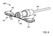 本明細書に記載の実施形態および/またはその一部は、1つ以上の生体適合性材料で形成または構築されることができる。いくつかの実施形態では、生体適合性材料は、例えば、剛性、靭性、デュロメータ、生体反応性などの、構成材料の1つ以上の特性に基づいて選択されることができる。適切な生体適合性材料の実施形態は、金属、ガラス、セラミック、またはポリマーを含む。好適な金属の実施形態は、医薬品グレードのステンレス鋼、金、チタン、ニッケル、鉄、プラチナ、スズ、クロム、銅、および/またはそれらの合金を含む。ポリマー材料は、生分解性または非生分解性であり得る。好適な生分解性ポリマーの実施形態は、ポリラクチド、ポリグリコリド、ポリラクチド-コ-グリコリド(PLGA)、ポリ無水物、ポリオルトエステル、ポリエーテルエステル、ポリカプロラクトン、ポリエステルアミド、ポリ(酪酸)、ポリ(吉草酸)、ポリウレタン、ならびに/またはそれらのブレンドおよびコポリマーを含む。非生分解性ポリマーの実施形態は、ナイロン、ポリエステル、ポリカーボネート、ポリアクリレート、エチレンビニルアセテートおよび他のアシル置換セルロースアセテートのポリマー、非分解性ポリウレタン、ポリスチレン、ポリ塩化ビニル、ポリフッ化ビニル、ポリ(ビニルイミダゾール)、クロロスルホネートポリオレフィン、ポリエチレンオキシド、ならびに/またはそれらのブレンドおよびコポリマーを含む。 Embodiments and/or portions thereof described herein can be formed or constructed of one or more biocompatible materials. In some embodiments, a biocompatible material can be selected based on one or more properties of the material of construction, eg, stiffness, toughness, durometer, bioreactivity, and the like. Embodiments of suitable biocompatible materials include metals, glasses, ceramics, or polymers. Preferred metal embodiments include pharmaceutical grade stainless steel, gold, titanium, nickel, iron, platinum, tin, chromium, copper, and/or alloys thereof. The polymeric material can be biodegradable or non-biodegradable. Embodiments of suitable biodegradable polymers include polylactides, polyglycolides, polylactide-co-glycolides (PLGA), polyanhydrides, polyorthoesters, polyetheresters, polycaprolactones, polyesteramides, poly(butyric acid), poly( valeric acid), polyurethanes, and/or blends and copolymers thereof. Non-biodegradable polymer embodiments include nylons, polyesters, polycarbonates, polyacrylates, polymers of ethylene vinyl acetate and other acyl-substituted cellulose acetates, non-degradable polyurethanes, polystyrene, polyvinyl chloride, polyvinyl fluoride, poly(vinyl imidazole), chlorosulfonate polyolefins, polyethylene oxide, and/or blends and copolymers thereof.