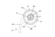 なお、以下では、保持シャフト71に対するクランプシャフト6(ロック部67)の周方向位置については、ロック部67がロック孔714を通過可能な位置(図8に示す位置)を、アンロック位置といい、ロック部67がロック孔714を通過不能であって、保持シャフト71に係合可能な位置(例えば、図7に示す位置)を、ロック位置という。本実施形態では、周方向における保持シャフト71とクランプシャフト6(ロック部67)との相対的な位置関係は、後述の解除レバー81の操作、または、保持シャフト71へのクランプシャフト6の挿入に応じて変化する。この点については、後で詳述する。  In the following, regarding the circumferential position of the clamp shaft 6 (lock portion 67) with respect to the holding