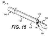 スコープ1400と実質的に同様であるスコープ1500が図15に示されているが、スコープ1500は、少なくとも1つの追加のルーメン1513を含み得る。偏向ツール1516が追加のルーメン1513を通って延び得る。偏向ツール1516は、偏向ツール1416と実質的に同様であり得、実質的に同様に使用され得る。スコープ1500の遠位端におけるルーメン1513の開口は平面内にあり得、偏向ツール1516は、開口の平面に対して実質的に直交する軌道に沿って遠位端1504から離れるように遠位に延びるように構成され得る。  A
