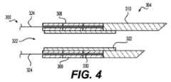 リンク308は、リンク308もまた1つまたは複数の作動ルーメン326を含み得ることを除いて、上述のリンク108と実質的に同様であり得る。図3および図4に示されている態様では、各リンク308は、互いに直径方向で反対向きである(たとえば180度の弧長によって分離される)2つの作動ルーメン326を含む。しかし、他の好適な数の作動ルーメンおよび/または間隔を使用してもよいことも企図されている。また、各リンク308は、リンク308の中央を通って延びる流体ルーメン328を含んでもよい。医療デバイス300が剛性構成にあるとき、リンク308の作動ルーメン326は、作動ルーメン330を形成するように互いに位置合わせされ得、流体ルーメン328は、流体ルーメン332を形成するように互いに位置合わせされ得る。遠位先端310は、図1および図2を参照して上述した遠位先端110と実質的に同様であり得る。