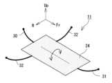 また、本例では、後吊りワイヤ33および前吊りワイヤ34を、適度な弾性を有する弾性フレーム22に取り付けている。かかる構成とすることで、路面からの振動入力の一部が、吊りワイヤ33,34に伝達されることなく、弾性フレーム22の弾性変位で吸収される。その結果、乗員100の乗り心地をより向上できる。  Further, in this example, the