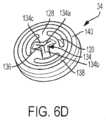 図6Dを参照すると、少なくとも1つのスリット134は、実質的にY字形状にされてよく、このとき3つの個々のスリット134a、134b、134cは、その端点の1つにおいて互いに連結されている。スリット134a、134b、134cは、これらの間の均等または不均等の角度でスリット134a、134b、134cが交差するように配向され得る。各スリット134a、134b、134cは、本体100の遠位部分104の少なくとも一部分を通って、中央軸106に沿う方向に延びることができる。各スリット134a、134b、134cは、実質的に、線形、湾曲状、またはその組み合わせであってよい。スリット134a、134b、134cは、望ましくは、膜34を通る針58の挿入中にスリット134a、134b、134cの交差点136を通って針58が貫通するように配向される。  Referring to FIG. 6D, at least one